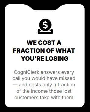 CogniClerk answers every call you would have missed — and costs only a fraction of the income those lost customers take with them.